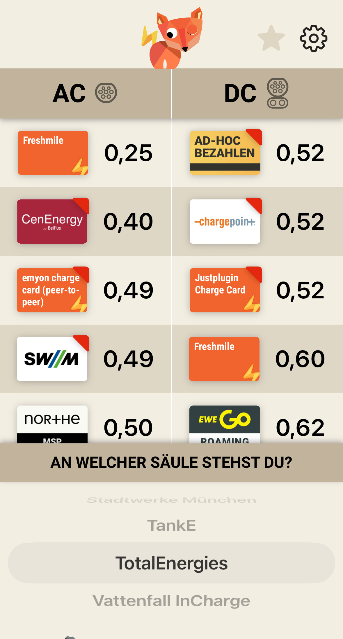 Ich glaube der Preis von Ladefuchs ist leider falsch. Hätte mich auch gewundert, weil die hier in Berlin fürs AC Laden schon 54ct nehmen.