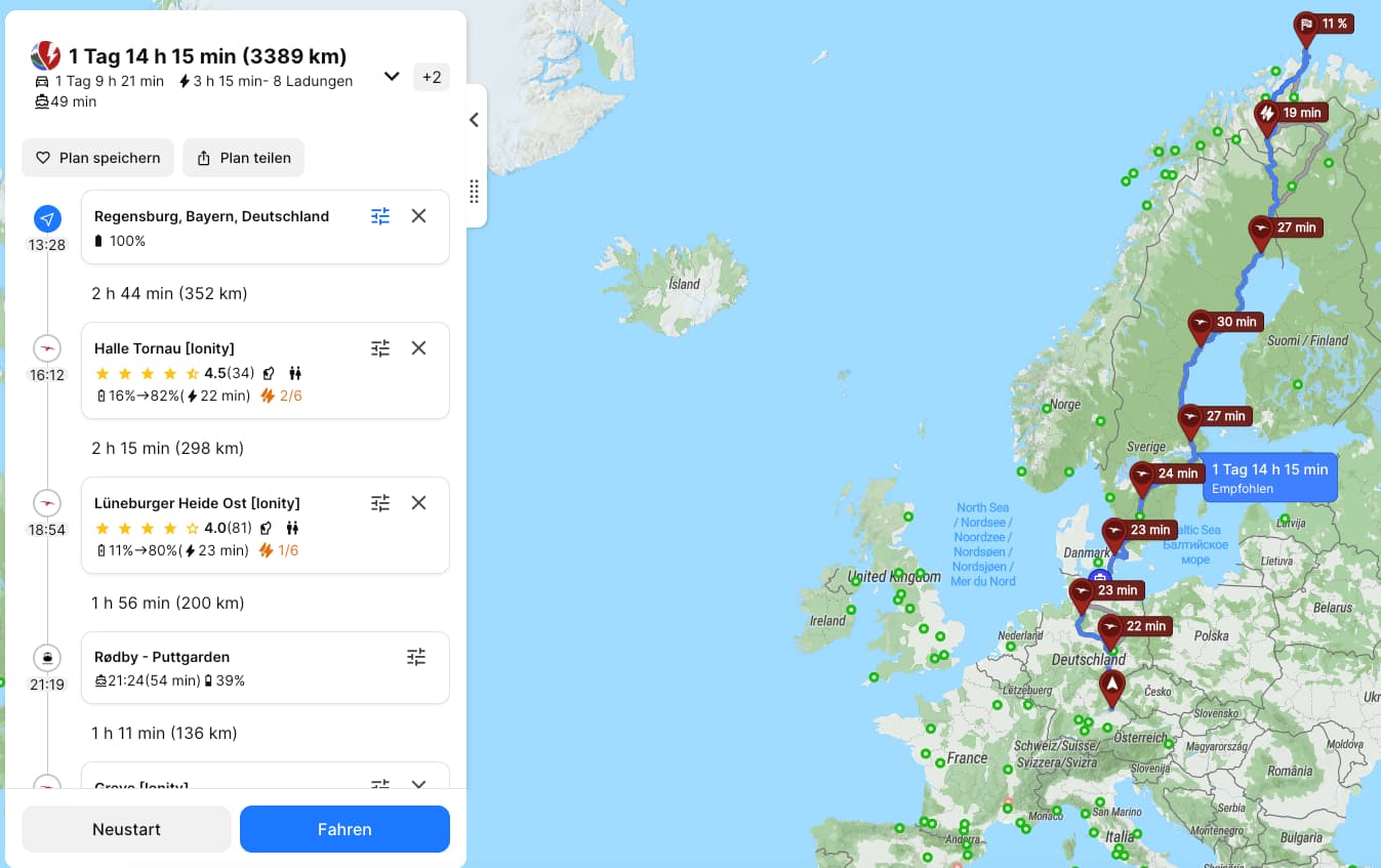Laut ABRP benötige ich mit dem Standard Range gerade mal 43 Minuten länger an den Nordkap, ich benötige zwar einige Ladungen mehr, aber dafür noch kürzere Ladevorgänge. Die Einstellungen waren die gleichen und der Filter war auf Ionity Direct gesetzt.