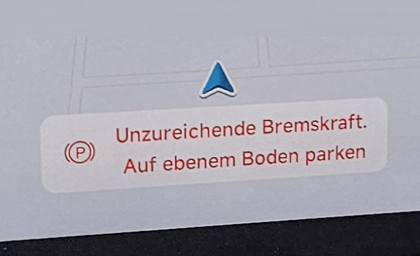 Ich gehe davon aus, dass es eine Falschmeldung ist, da die Parkbremse gezogen ist. Wird sowohl oben links im Fahrerdisplay angezeigt und man hört sowohl beim Einlegen von D den Stellmotor beim Lösen der Bremse als auch beim Einlegen von P das Anziehen. Das Geräusch klingt auch völlig korrekt.