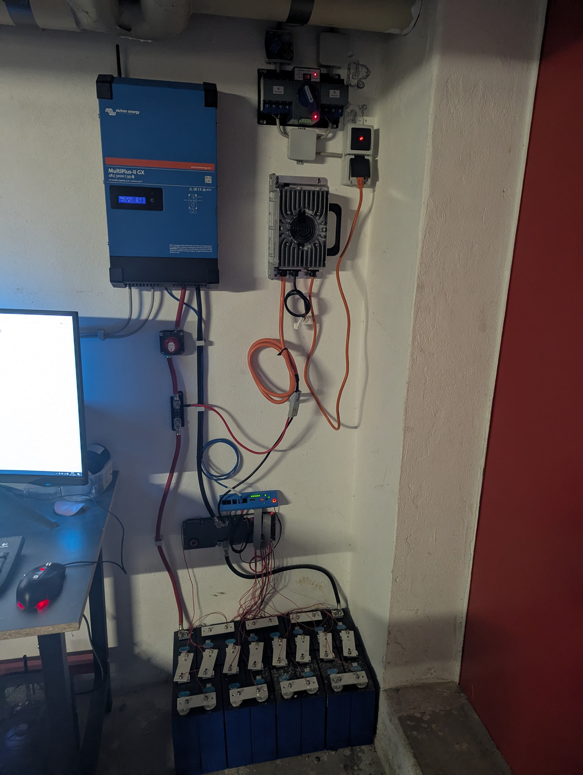 Der abgegriffene 230V AC geht durch ein 48V DC Ladegerät parallel in ein JK BMS das vor einer 16 x LifePo4 Akkubank (EVE MB31) hängt. Ein Victron Multiplus II GX speißt daraus das Hausnetz aus 48V DC mit 230V AC über die ESS Funktion. (den Victron kann man darauf sogar sehr fein einstellen wenn man das auf dem Venus OS installiert: GitHub - mr-manuel/venus-os_dbus-serialbattery: Battery Monitor driver for serial battery in VenusOS GX systems )