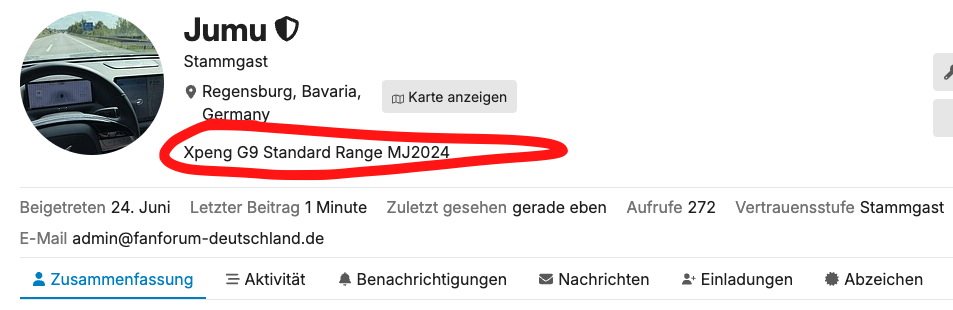 wir haben hier im Forum unterschiedliche Modelle von XPeng deren Ausstattung und Leistung unterschiedlich sein kann. Wenn wir von unseren Autos berichten, wissen andere nicht, von welchem Modell die Rede ist. Wenn es die Möglichkeit einer Signatur für die Posts gäbe, könnte jeder von uns dort sein Modell und Ausstattung angeben und die Mitlesenden sehen sofort von welchem Modell die Rede ist. Im Kona Forum habe ich das als sehr praktisch wahrgenommen.