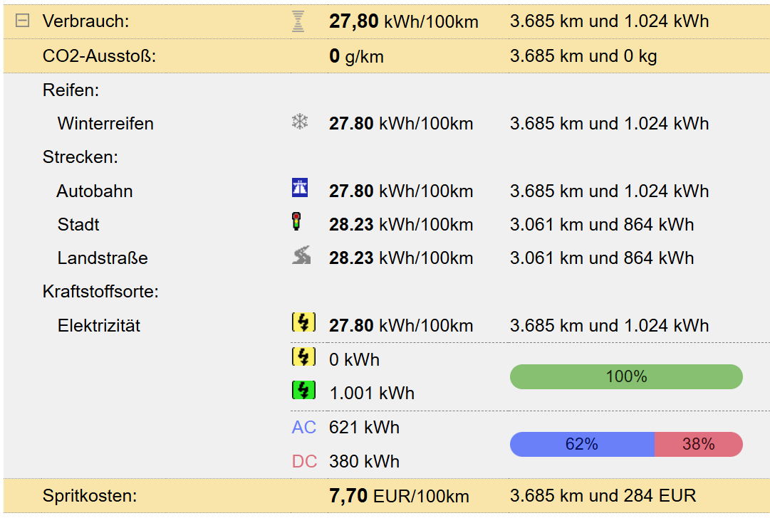 Real, also inkl. Ladeverluste, sind es bei mir 30 kWh, die letzten 1.000 km