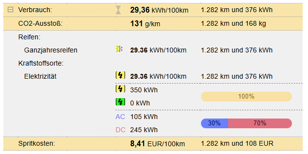 Das sind 23,59KW auf 100km oder für mich 23,59KW x 0,203€ = 4,79€ auf 100km