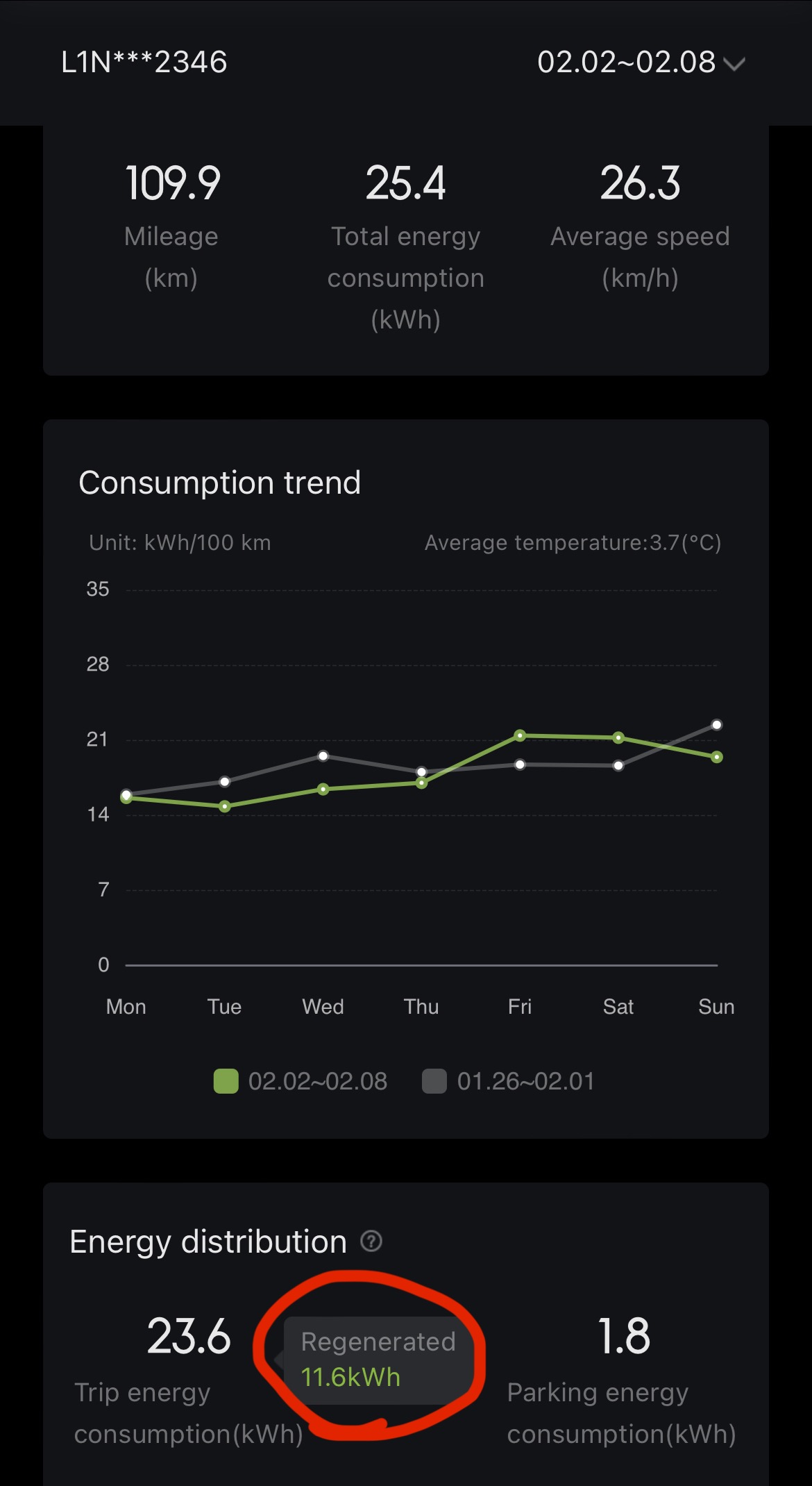 Die Werte können nicht stimmen, ich fahre ja meist auf geraden Straßen, zwar vorausschauend, aber oft beschleunige ich auch stark. Anteil Rekuperation „Regenerated“ liegt letzte und diese Woche bei fast 50 %, das kann rein physikalisch nicht stimmen: