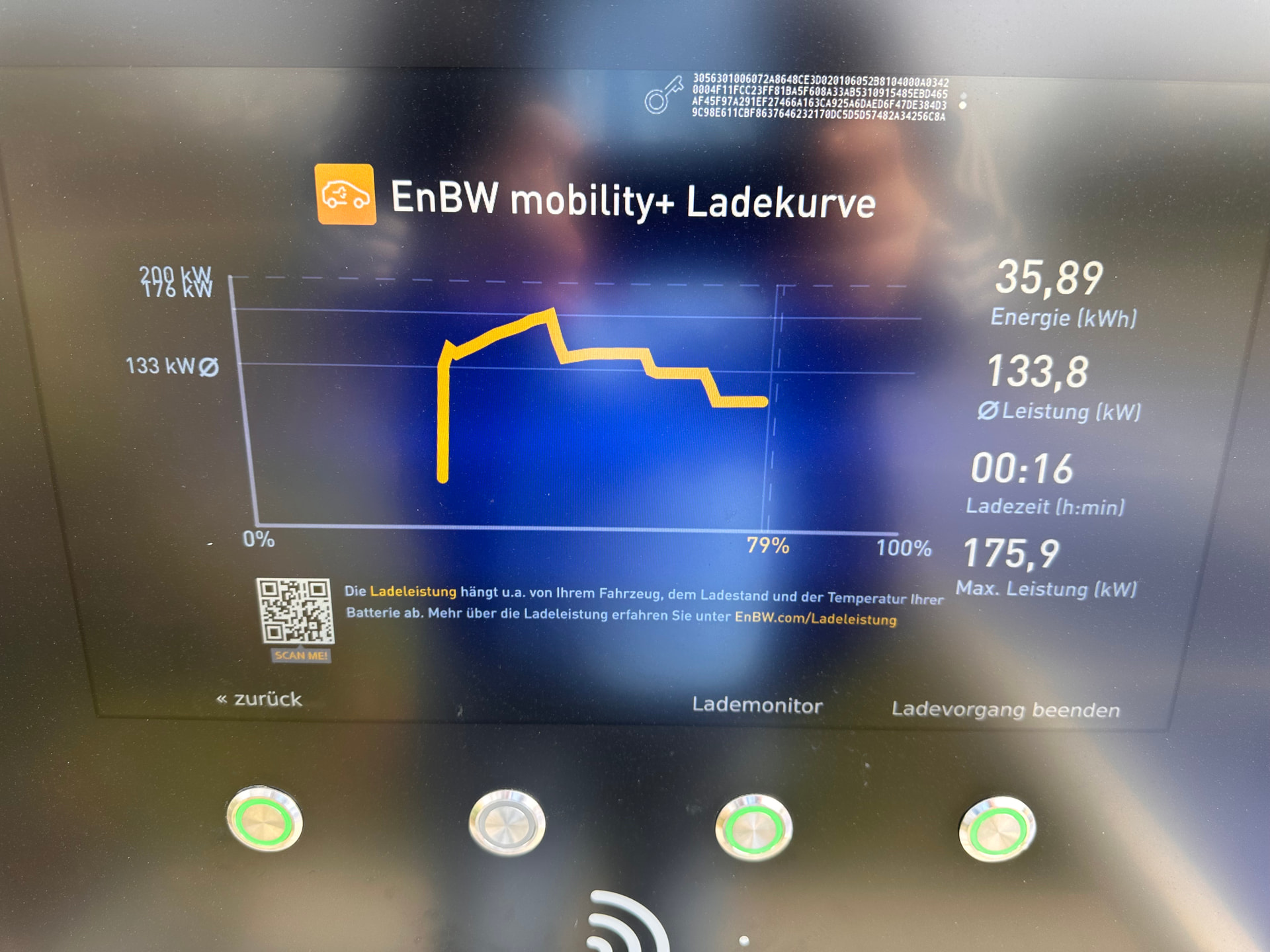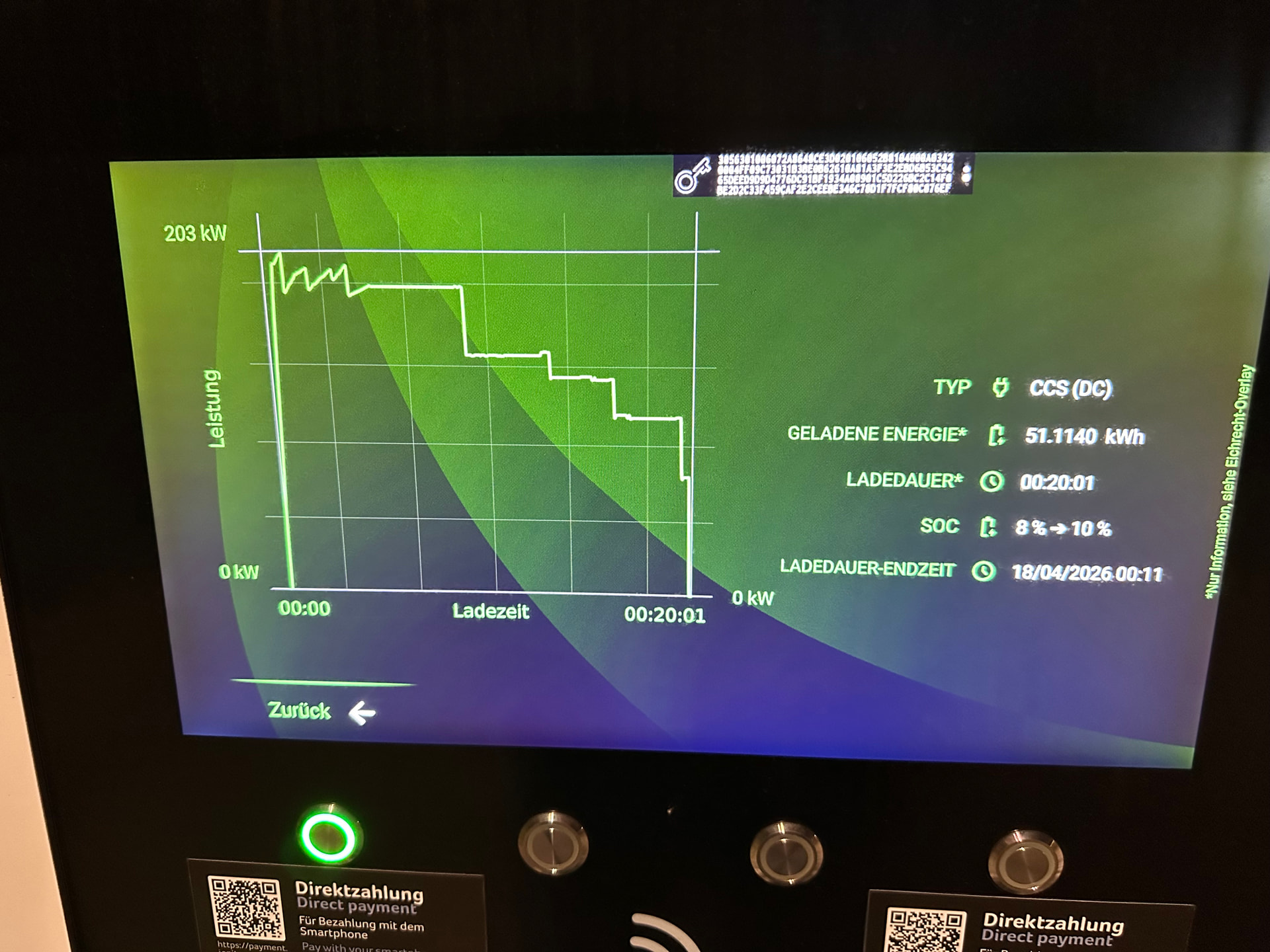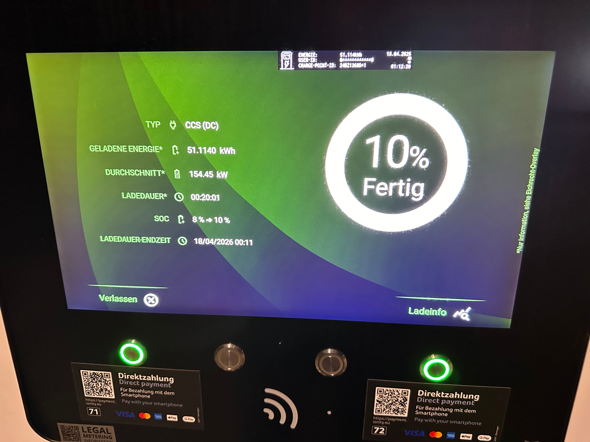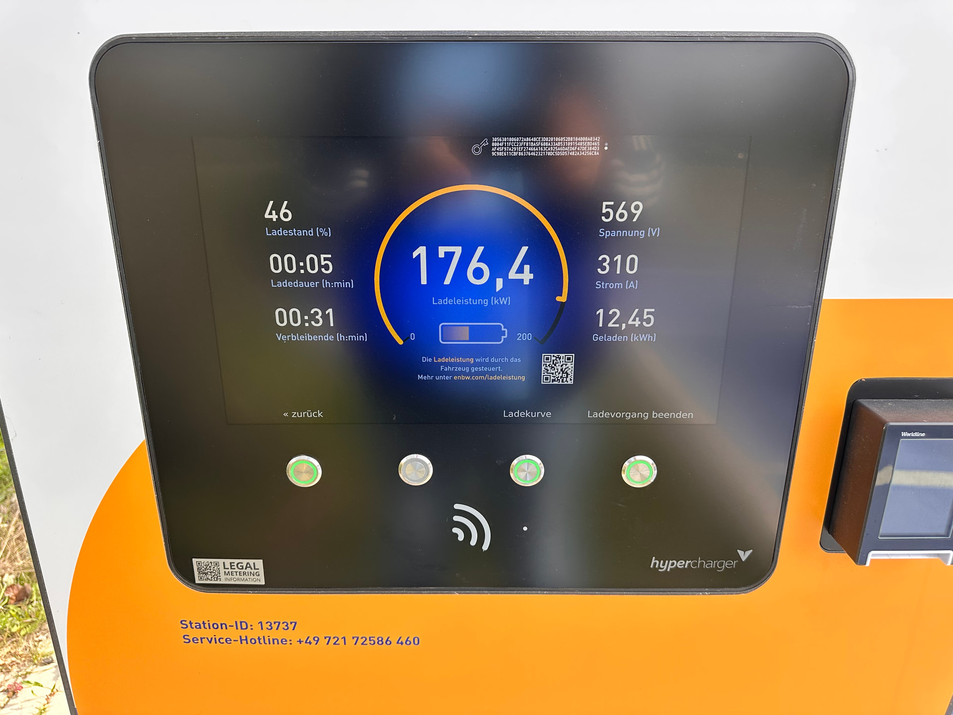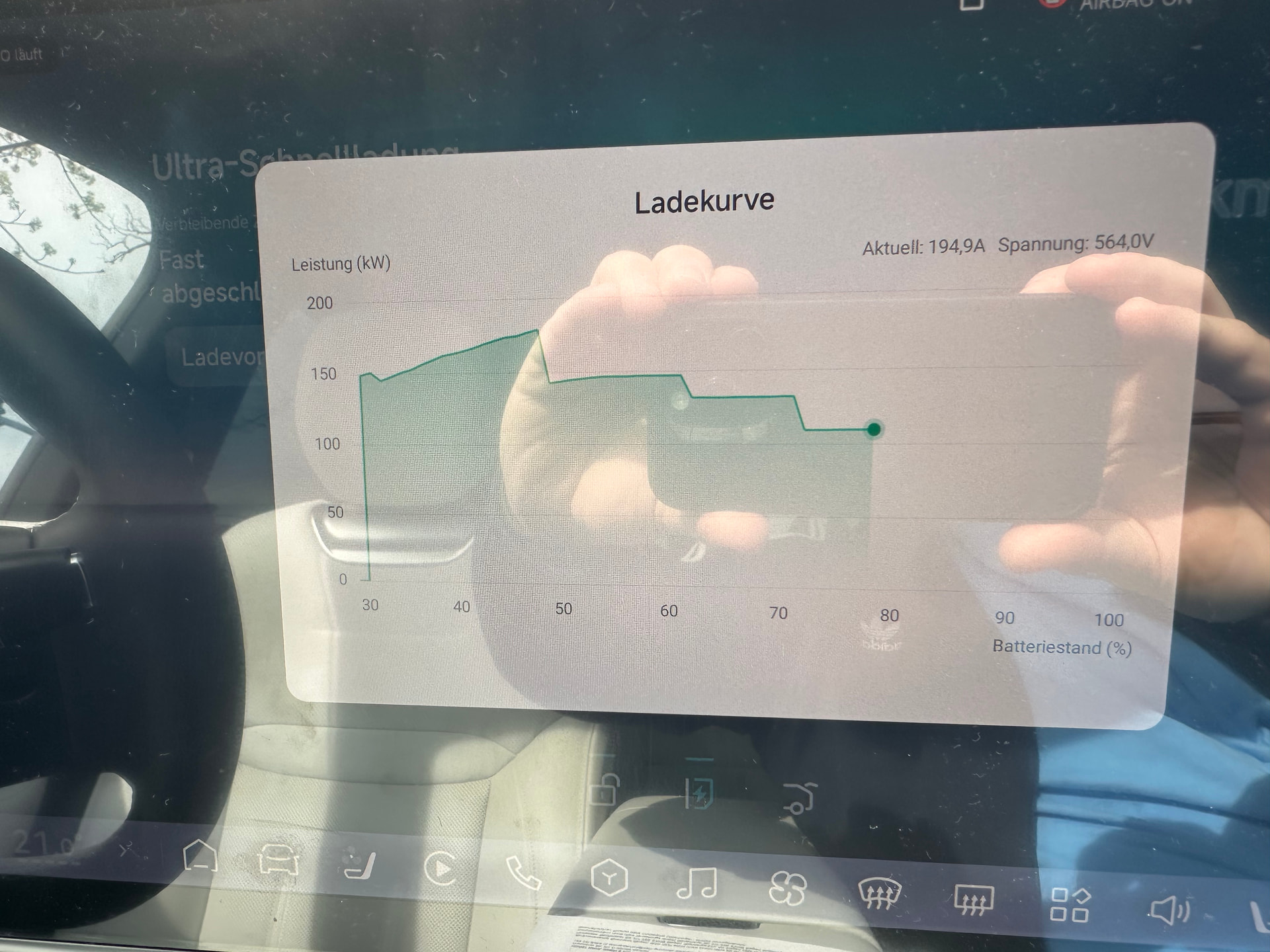 Die Geschwindigkeit empfinde ich als schon ziemlich gut. Das Teil ist bei weitem nicht mit den neuen zu vergleichen. Die 215kW sind irgendwo zwischen 15-25% erreichbar. Danach geht’s schon etwas runter.