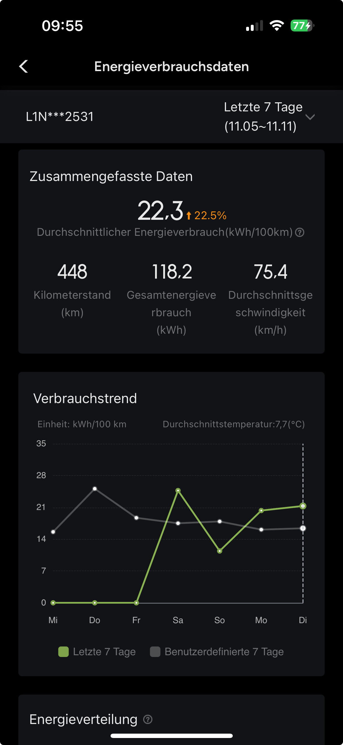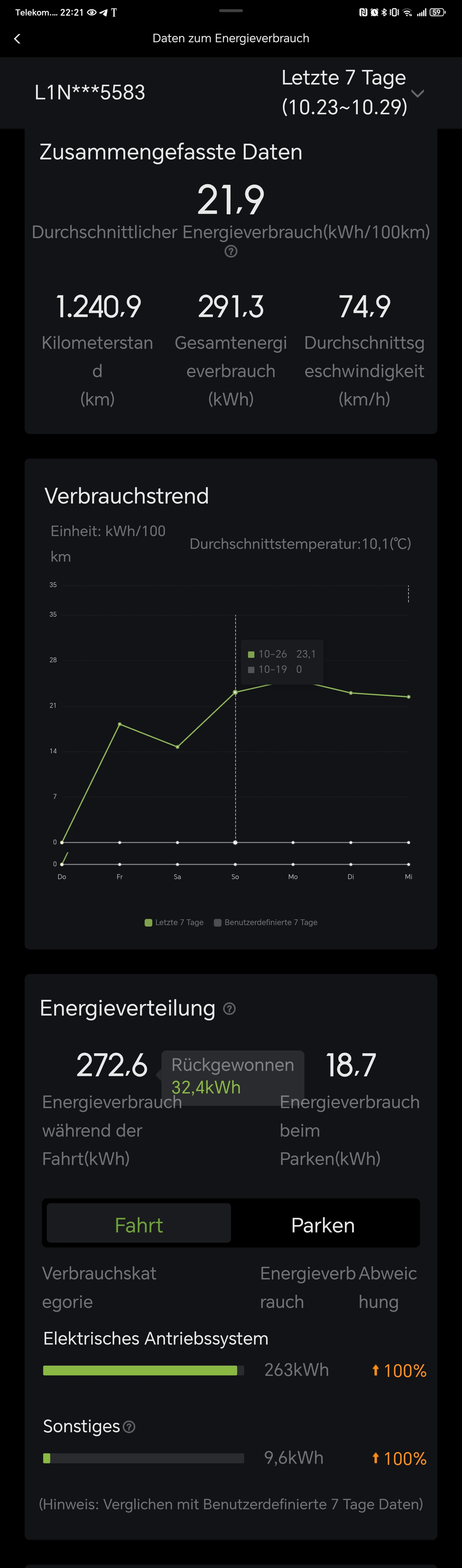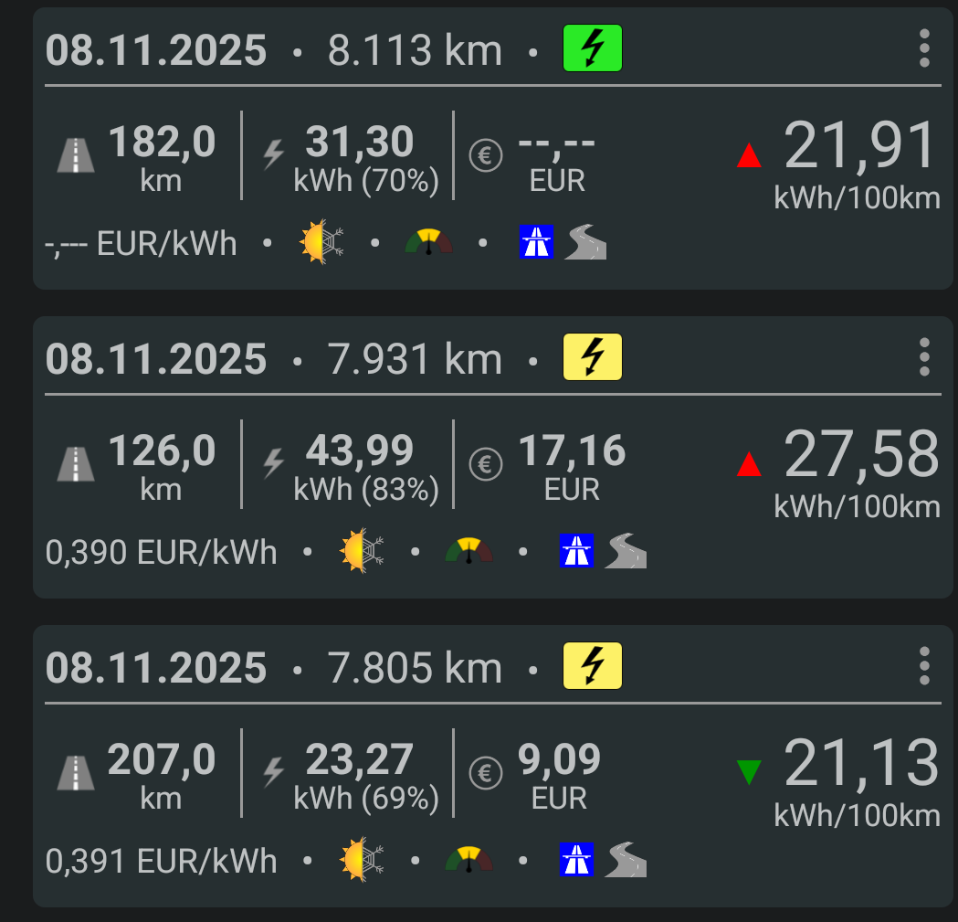 So wie bei euch sieht das in meiner App auch aus. Über die letzten Wochen immer bei 20 - 22 Kw/h. Nur, was nützt mir der Verbrauch den mir das Auto vorgaukelt, wenn ich am Lader dann trotzdem 30/kw für 100 KM kaufen muß.