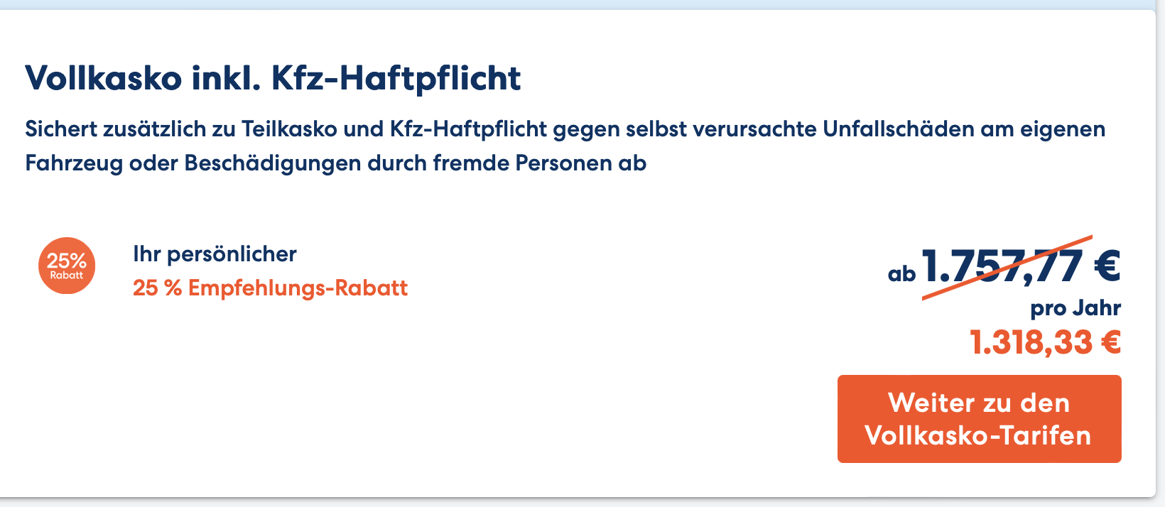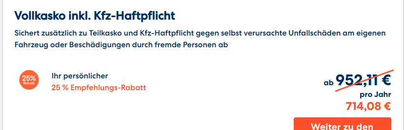Also bei mir sind es tatsächlich nur 50, aber halt zum Standard Tarif und über 100 zu dem für mich schlechteren Sikom Angebot. Bei Huk24 hab ich zusätzlich 36 Monate Neupreisentschädigung mit drin.