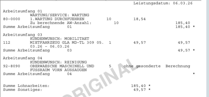 Erster Service (20.000km) bei Hedin in Schwetzingen für den G9 182 Euro. Gewaschen wurde er aber nicht.
