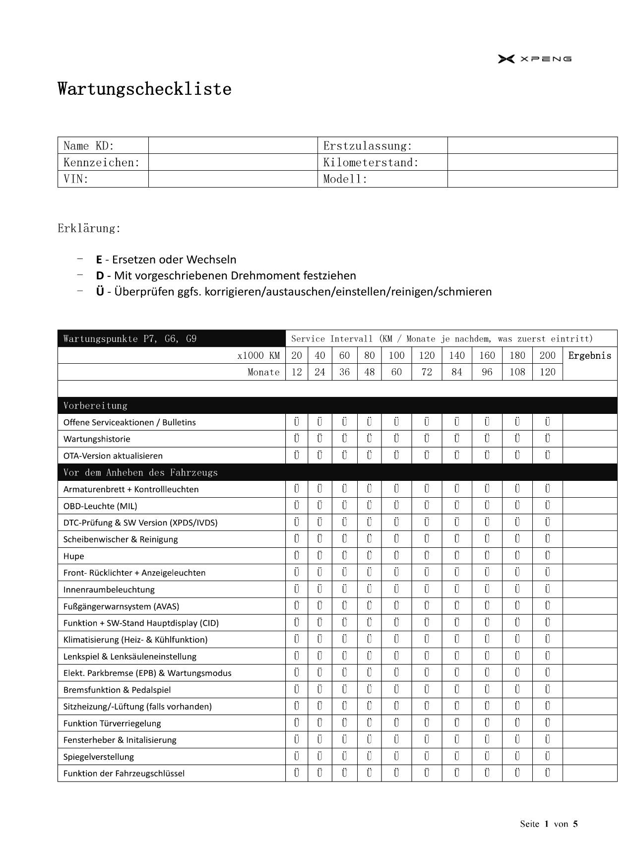 Ein Anspruch aus der Garantie besteht nur dann, wenn während der Laufzeit der Garantie alle Serviceintervallarbeiten („Regelservice“) nach den Vorgaben des Garantiegebers durchgeführt werden. Die Serviceintervalle sind aus dem digitalen Benutzerhandbuch ersichtlich. Andernfalls wird der Garantiegeber von seinen Verpflichtungen aus dieser Garantie befreit.