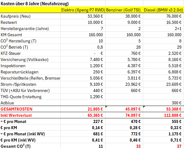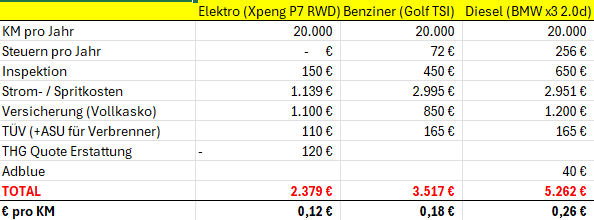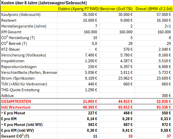 Hier mal meine Auswertungen, seitdem ich den P7 habe. Es ging mir darum, Argumente “stichfest” machen, warum man ein BEV kaufen soll statt Benziner oder Diesel. PHEVs habe ich ausgelassen, weil das die größte Dreckschleuder und auch teuerste Fahrzeuge überhaupt sind.