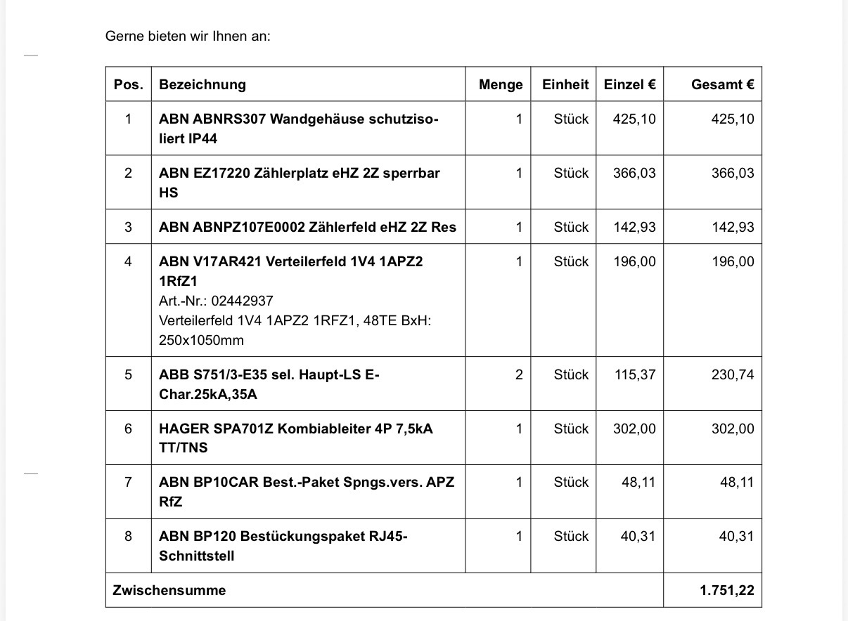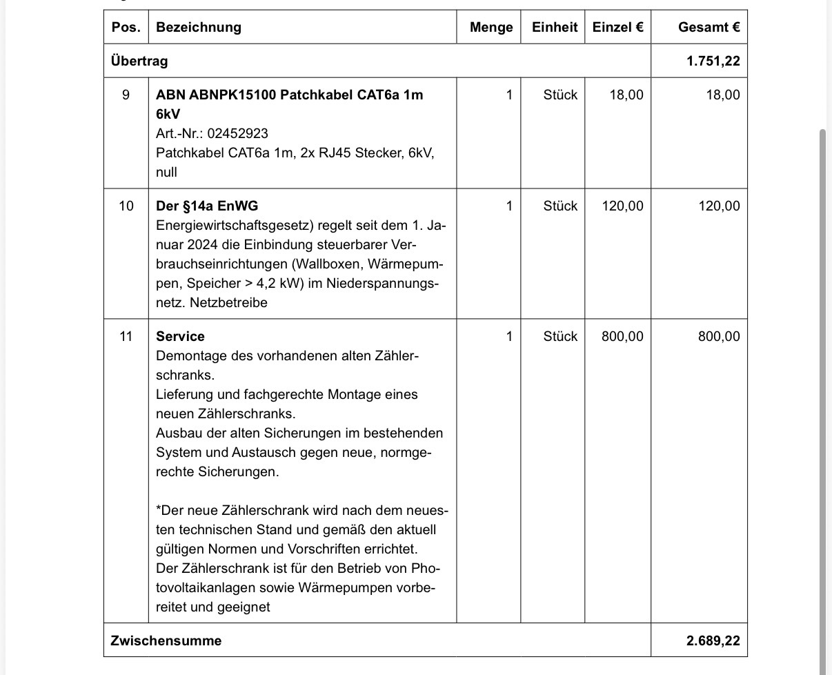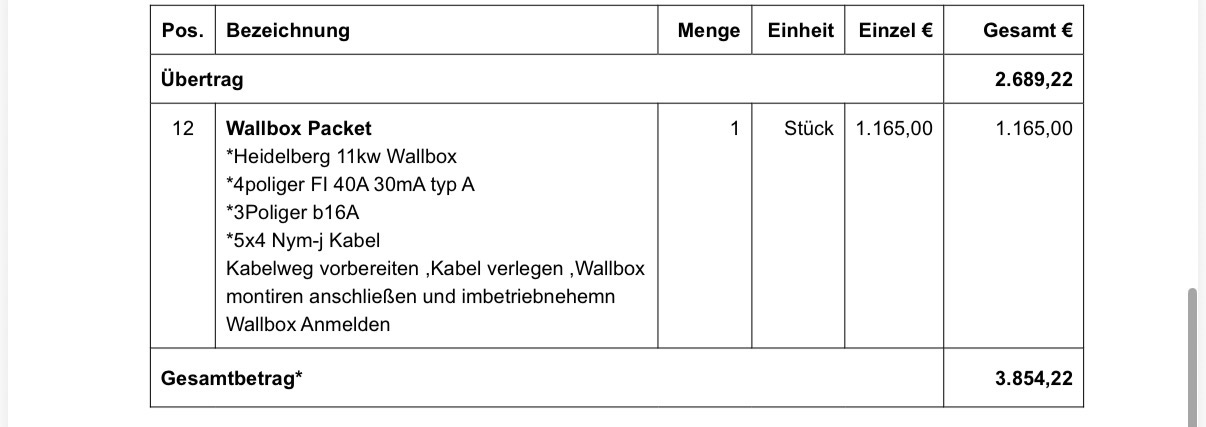 Gut, also da fällt auf, dass die Wallbox schon mal mit einem Mondpreis kalkuliert ist. Das Teil bekommt man im freien Handel für ca. die Hälfte. Warum ein Paragraph (Position 10) 120€ kosten soll, ist ebenfalls kaum nachvollziehbar.