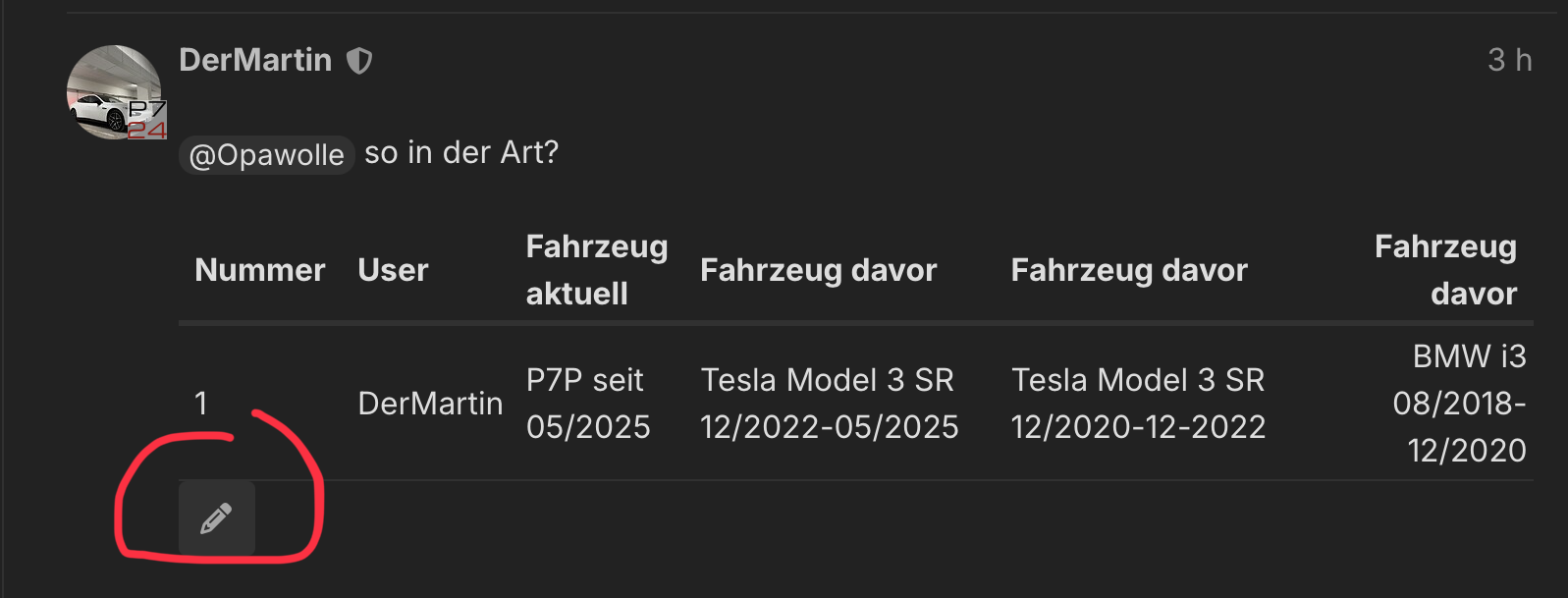 | 1 | DerMartin | P7P seit 05/2025 | Tesla Model 3 SR 12/2022-05/2025 | Tesla Model 3 SR 12/2020-12-2022 | BMW i3 08/2018-12/2020 |
