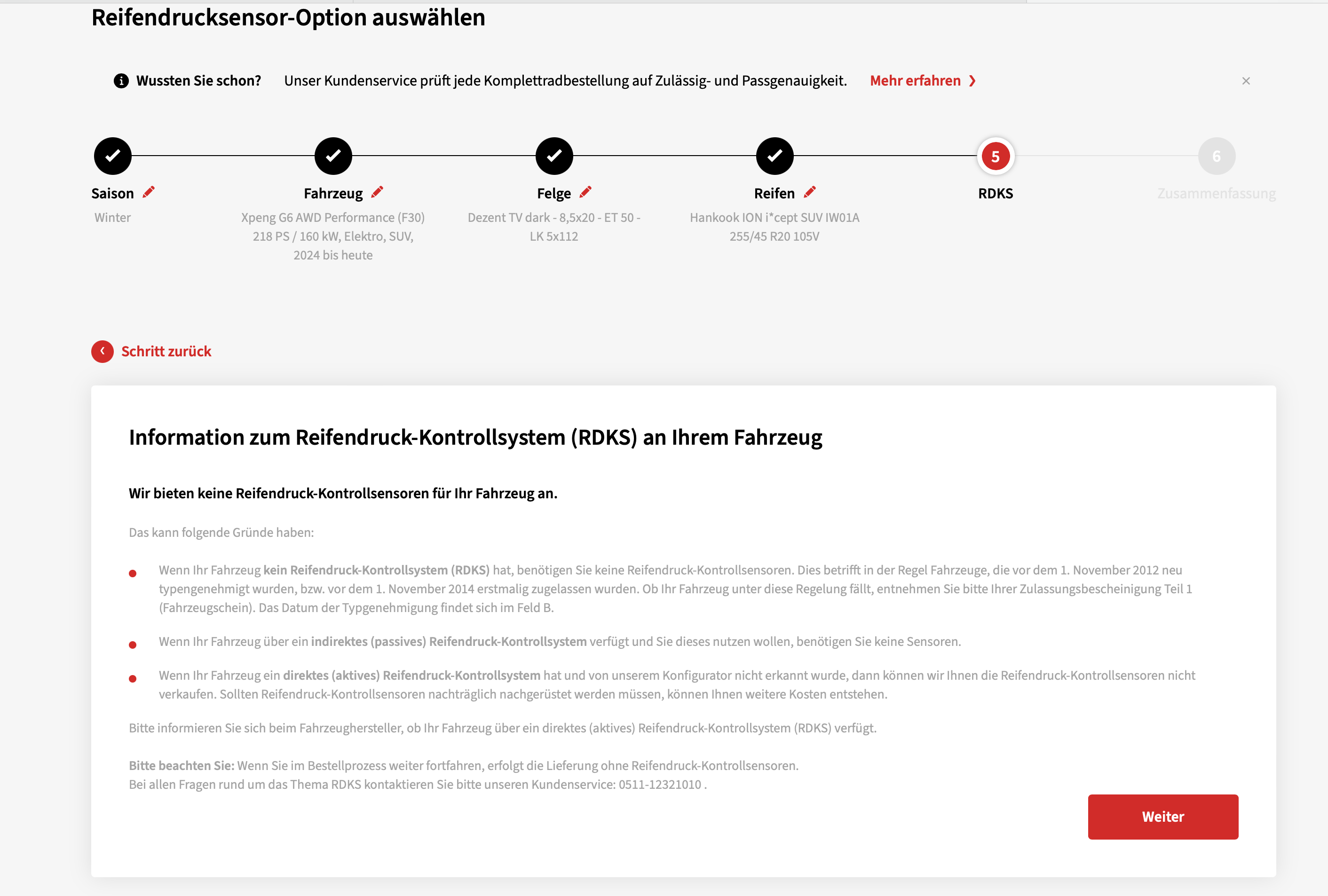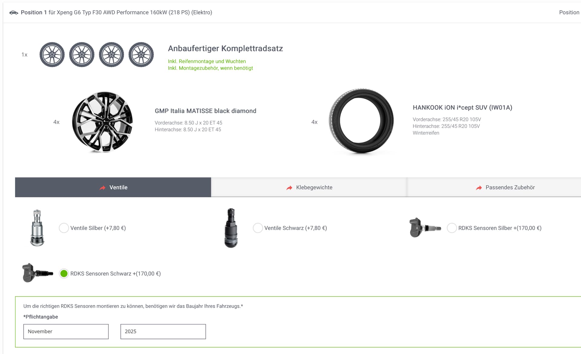 Nun stelle ich fest, dass manche Online-Anbieter, wie z.B. reifen.com, zwar gute Preise haben, aber leider keine Kompletträder mit RDKS anbieten (siehe Screenshot).