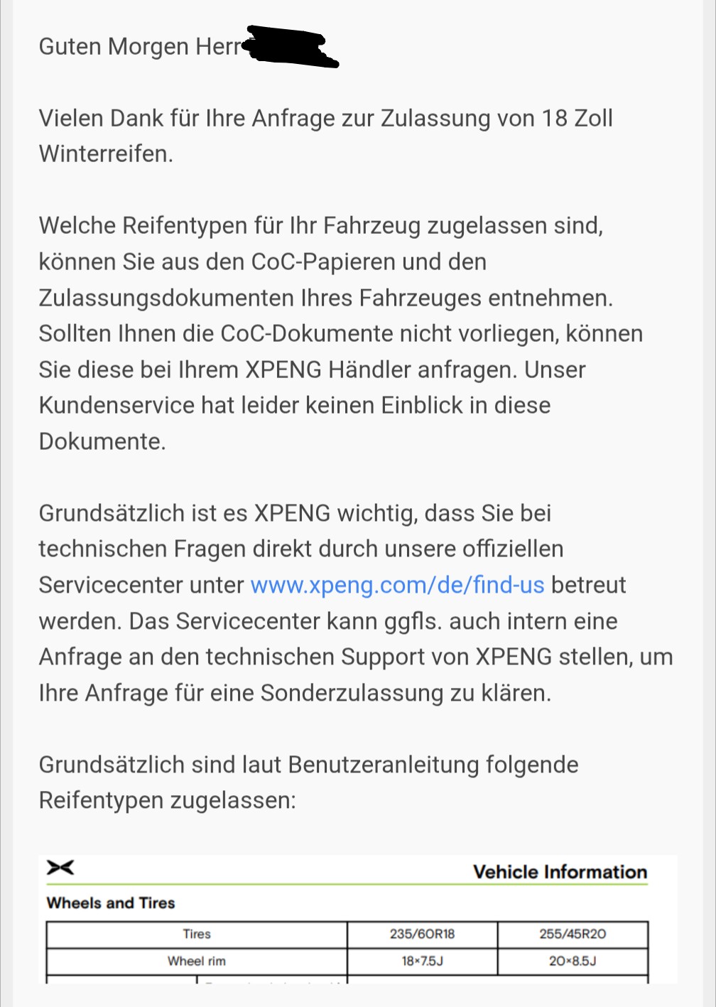 Guten Tag, ist es möglich für den Xpeng G6 Perfomance MJ25 auch einen 18 Zoll Winterrad beim deutschen Tüv abnehmen zu lassen? Als Beispiel Scorpion All Season SF3 235/60 R18 107 W XL Dieser Reifen hat sogar eine höhere Traglast als notwendig und wird von vielen Fahrzeugen in dieser Klasse gefahren. Bei einer 18 Zoll Felge mit einer ET 40 sollten auch alle Abstände eingehalten werden. Tachoanzeige bei 100 km/h würde um Minus 0,2 Prozent abweichen aud 99, 8 KM/h. Ich kann mir Vorstellen, dass dieses in Ihrer Technik Abteilung sehr schnell geprüft und eventuel sogar zugelassen werden kann. Es ist zu bemerken, dass schmalere Winterreifen im Winter besser im Handling sind.