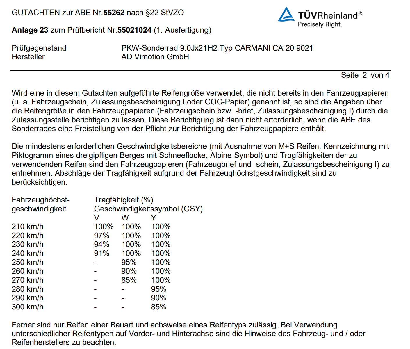 Leider haben die Reifen nur eine Traglast von 102 kg. Das Komplettrad wird mir mit ABE angeboten (felgenshop.de ).