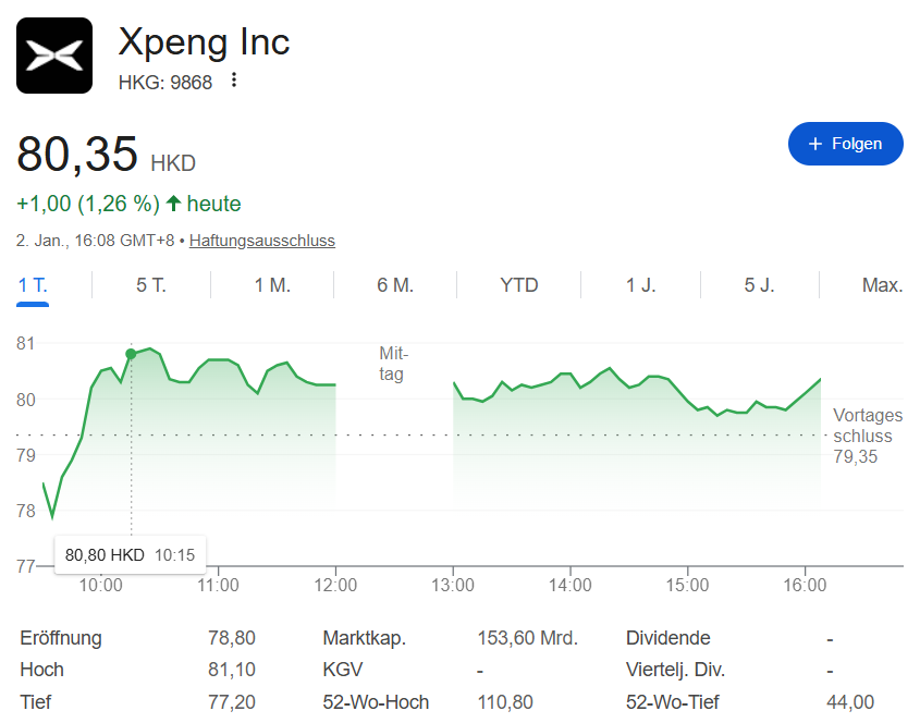 Die guten Verkaufspreise des P7+ bei uns und der Ausblick auf das was dieses Jahr noch kommt, haben mich heute doch noch ein paar Aktien von Xpeng kaufen lassen obwohl ich ja eigentlich nicht mehr wollte Aber ich bleibe optimistisch das es sich lohnt