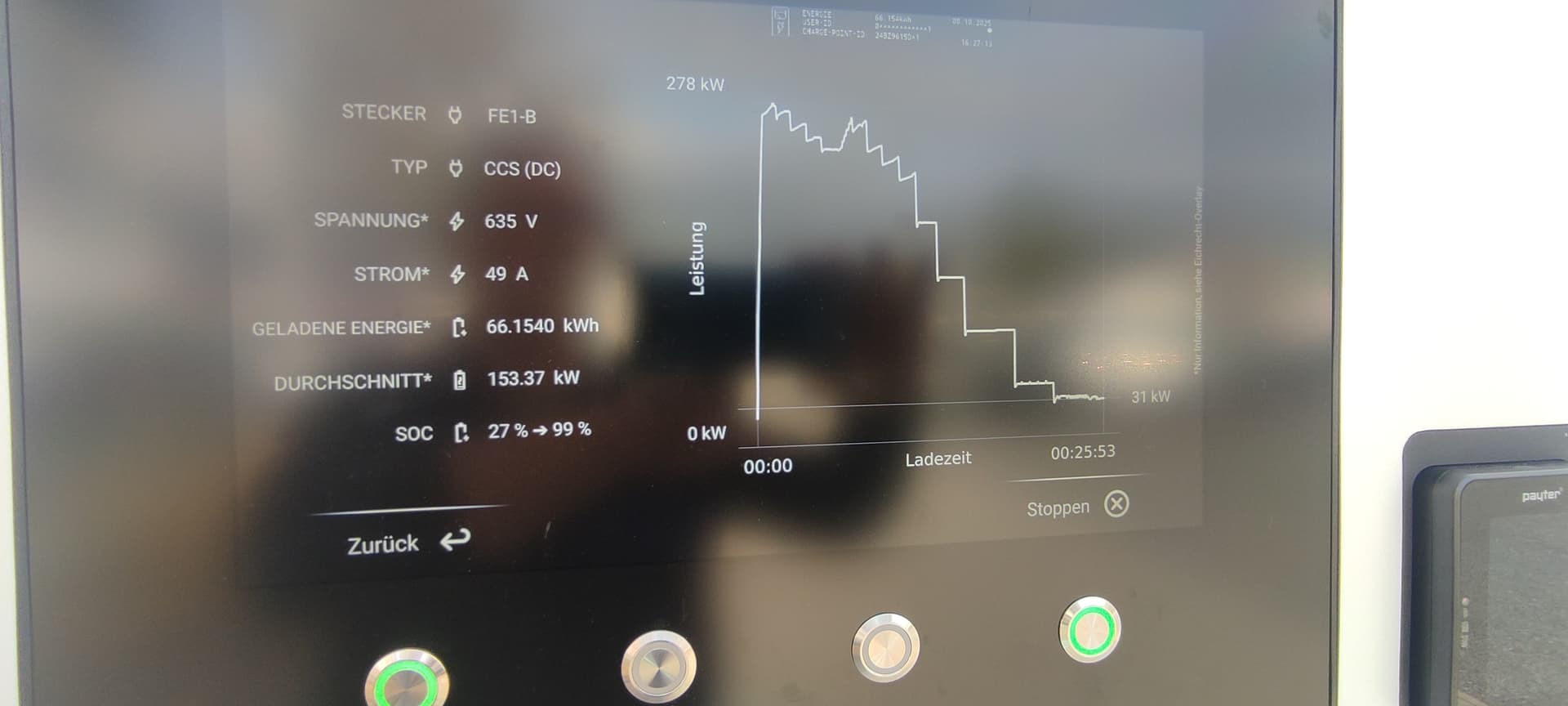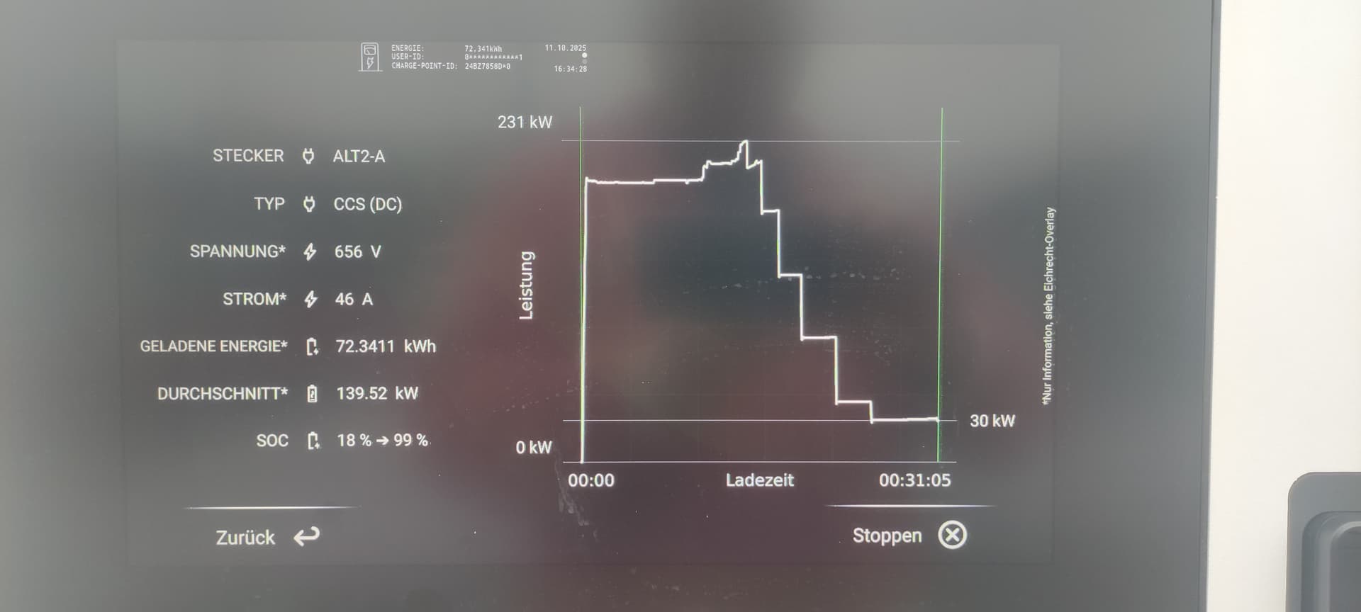 Ich habe jetzt in zwei verschiedenen Ladeparks der Eviny an einer 400KW Säule geladen. Hierbei ware ich jedesmal der Einzige vor Ort. Ich hatte mir dort eine Ladeleistung von 300+ erhoft. Beim ersten Laden kam ich nicht über 280KW hinaus und beim 2.mal lag der Peak bei 231kw.