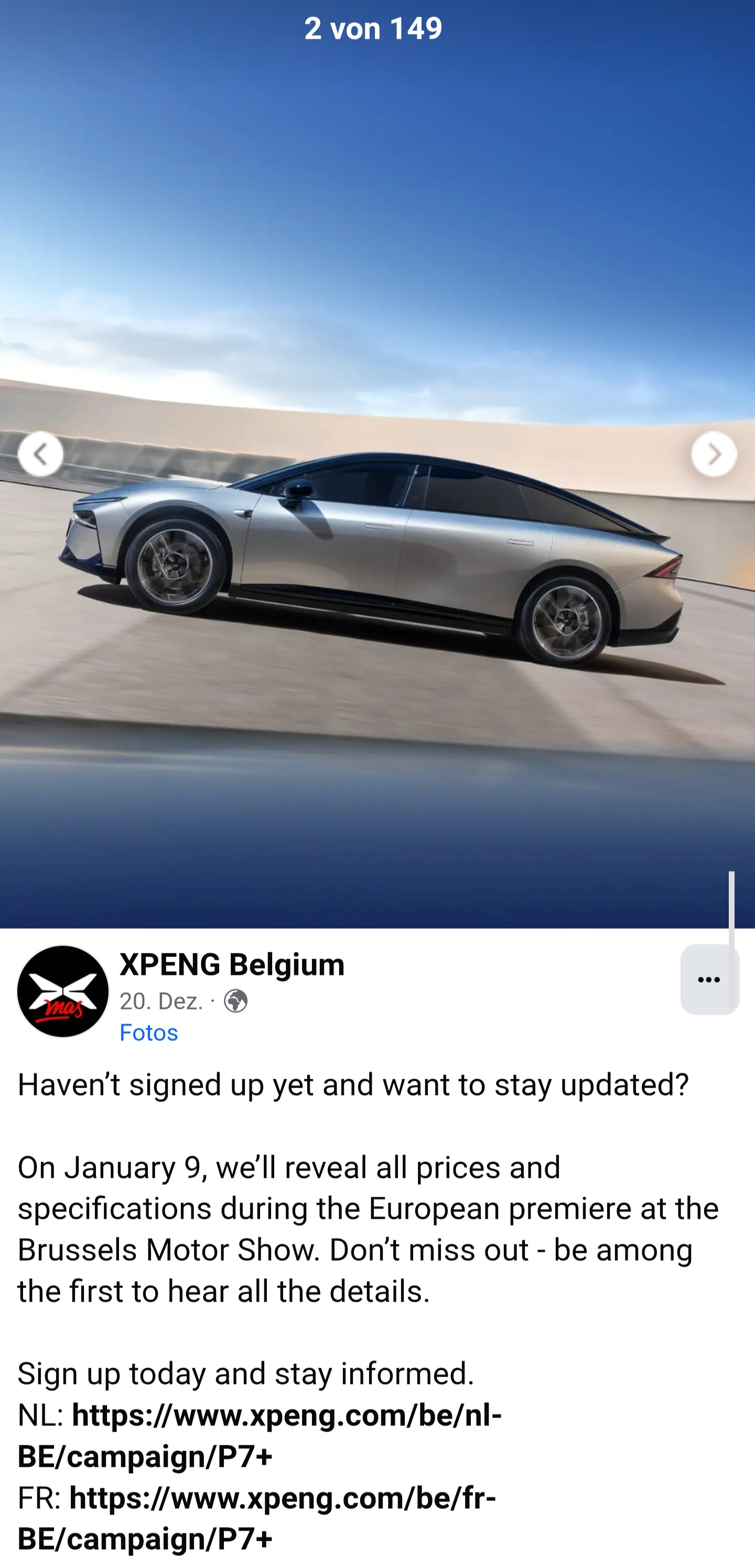 Laut offiziellem Facebook-Post will XPENG am 9. Januar im Rahmen der Brussels Motor Show alle Preise und Spezifikationen zum P7+ veröffentlichen.