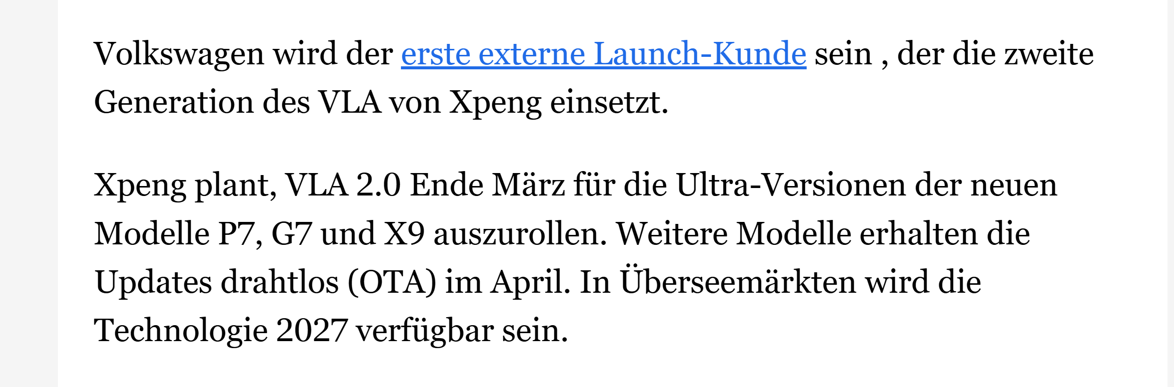 Ich habe den Eindruck, dass das VLA 2.0 von Xpeng besser ist. FSD gab schon viele Unfälle mit FSD und auch mit Todesfolge Ich traue dem System mit nur ein paar Kameras nicht, lieber mehr Sensoren und KI.