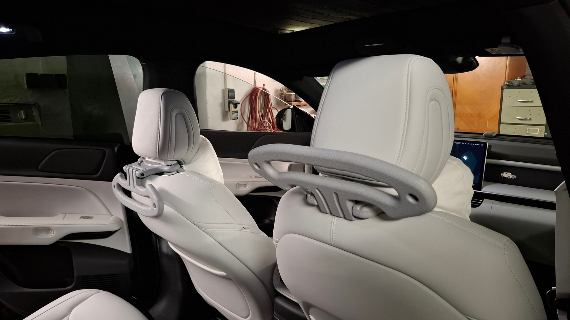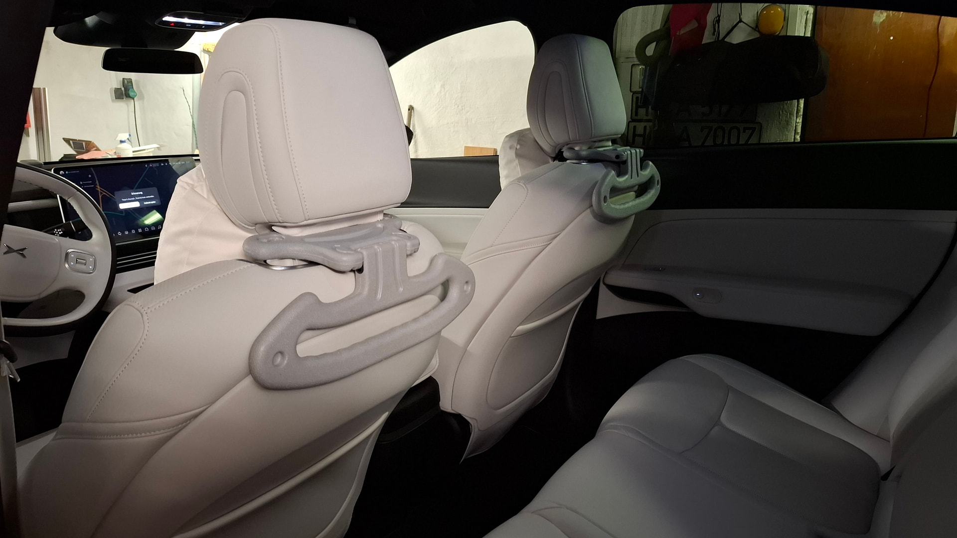 Zwei Kleiderbügel mit Gepäckhaken. Auf den ersten Blick sehen die Dinger nur billig aus und dann ist das Hellgrau dunkler als erwartet. Sie sind umklappbar und sind nicht auf der Höhe der Nackenstützen, was mir besonders wichtig ist, um die Sicht durch den Spiegel nicht noch mehr einzuengen.