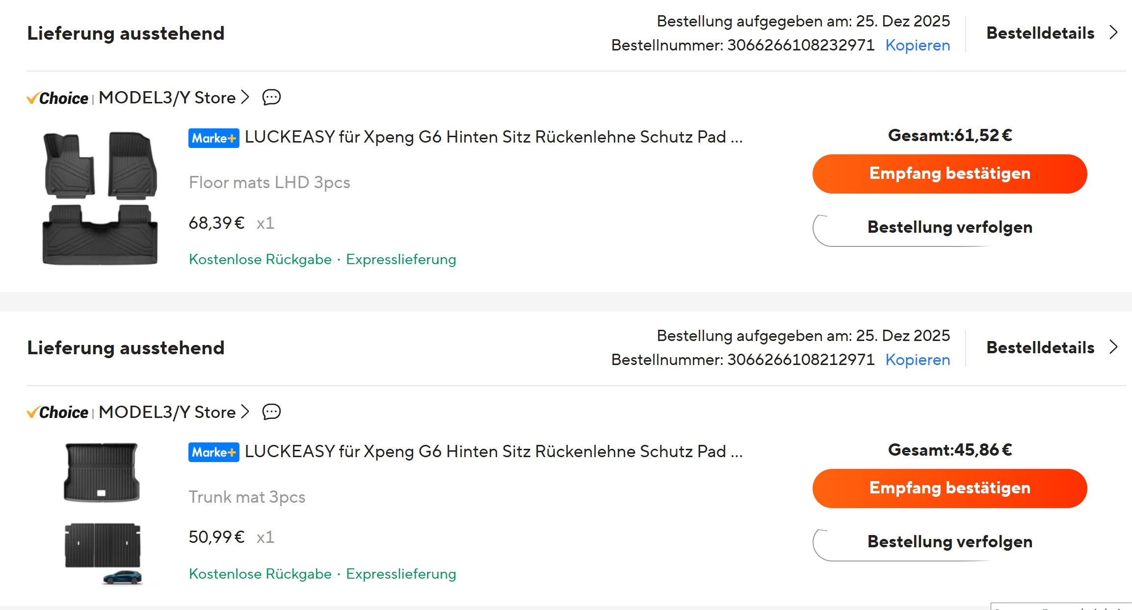 Die kommen denen die ich drei Jahre im Tesla hatte sehr nahe. Verarbeitung und Material wirkt stimmig, super verpackt und es hat keinen unangenehmen Geruch. Passform und Haltbarkeit werde ich dann erst im Gebrauch bewerten können.
